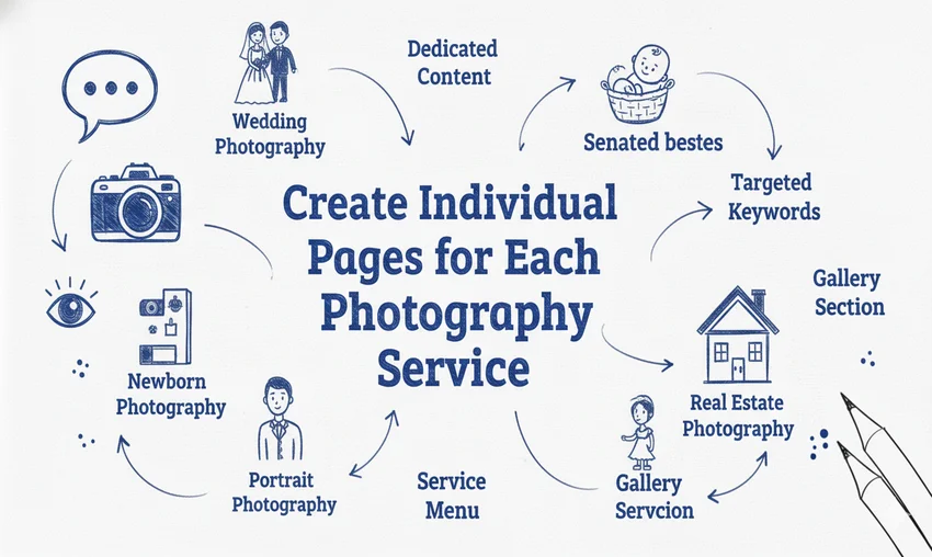 Each photography service—whether it’s weddings, portraits, events, or commercial shoots—deserves its own optimized service page. These pages help Google understand your offerings and improve visibility for high-intent search queries. This granular targeting ensures your studio ranks for exactly the services clients are looking for.